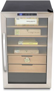 The NewAir CC-300 Cigar Cooler is a large capacity cooler that can store up to 400 cigars. It operates quietly with its thermoelectric cooling technology that can maintain a temperature as low as 54°F. This thermoelectric cooling system is driven by a fan, and it operates with no vibrations. It has an inbuilt thermostat that can adjust the temperature in 1-degree increments, which is best for regulating the temperature to suit your needs.